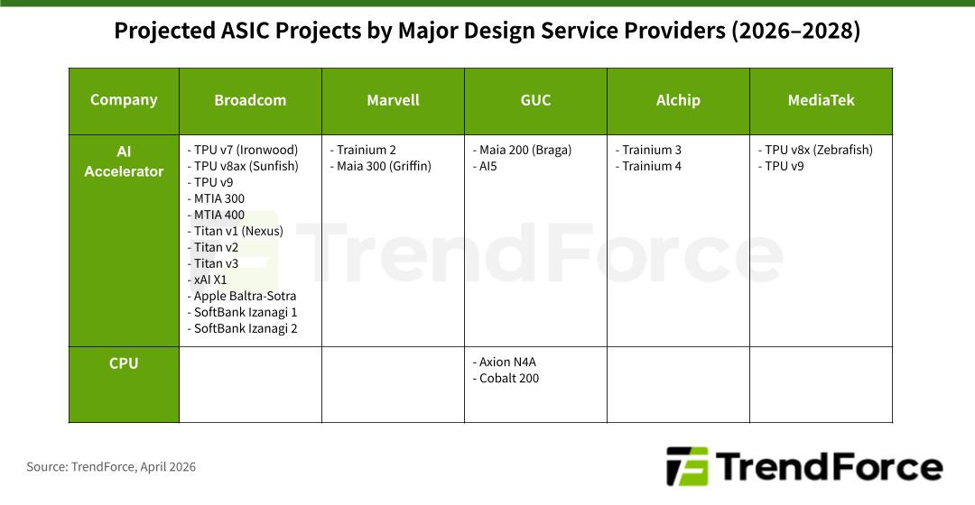 TrendForce expects the growing trend of major CSPs developing custom CPUs to create additional business opportunities for IC back-end design service providers. Currently, while AWS maintains its design in-house, both Google and Microsoft outsource their CPU back-end design services to Global Unichip Corp. (GUC). The following table summarizes the projected projects to be secured by ASIC design service providers between 2026 and 2028.
