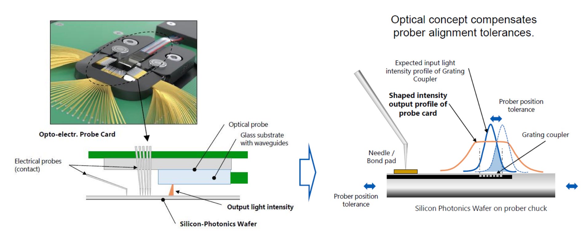 In June 2024, Advantest, Jenoptik, and Ayar Labs jointly launched the UFO Probe Card, integrating both electrical and optical probes on a single card for simultaneous electro-optical testing. Its key innovation is alignment tolerance compensation technology: the optical probe’s output beam is specifically shaped, allowing the optical signal to enter the PIC coupler even with slight prober positioning errors, greatly reducing alignment time.